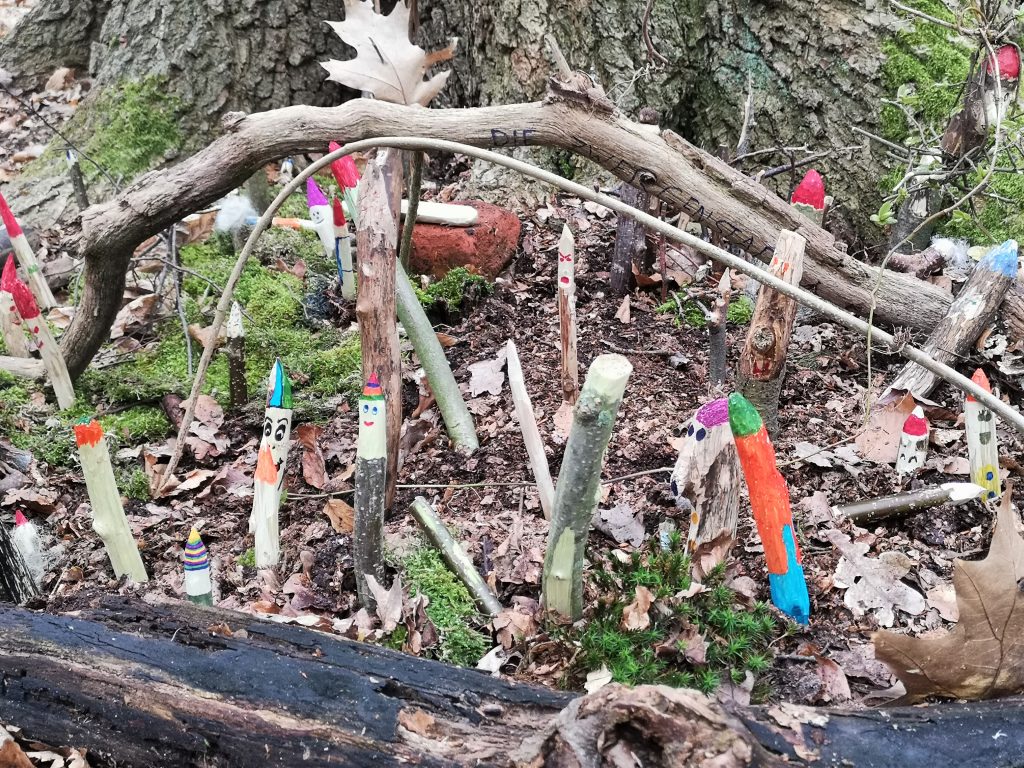 In der zweiten Hälfte des Vormittags hatten die Kinder verschiedene Angebote gewählt. Sie konnten beispielsweise eine Waldkugelbahn bauen, den Wald mit Tonfiguren verzaubern, Osternester bauen oder einen Barfußpfad erstellen. „Ich habe mich sehr darauf gefreut, heute mit meinem Freund Paul zum Schnitzen zu gehen“, berichtet der achtjährige Matti. „Wir haben kleine Waldwichtel geschnitzt und eine Zwergenstadt gebaut.“