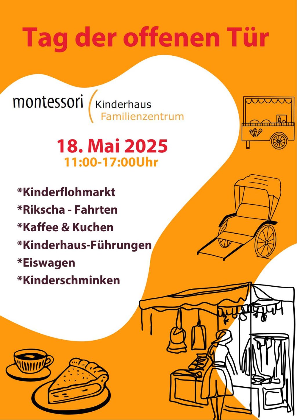 Am Sonntag, 18.05.25 lädt das Montessori-Kinderhaus in der Zeit von 11.00 – 17.00 Uhr herzlich zu einem Tag der offen Tür mit Kinderflohmarkt, Rikscha-Fahrten, Kinderhaus-Führungen, Eiswagen, Kinderschminken und Kaffee & Kuchen ein. Wir freuen uns auf Ihren Besuch!