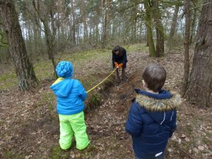 In regelmäßigen Abständen gehen die Kinder in ihren altersgemischten Gruppen in den Wald. Dort erleben wir den Wandel der Natur in ihren verschiedenen Jahreszeiten. Die Kinder fühlen den Waldboden unter den Füßen, die Baumrinde zwischen den Fingern. Wir balancieren, bauen Tipis, stauen Wasser mit Dämmen auf und erleben das Spielen in der Natur. Wir sind als kleine Forscher unterwegs, lesen Tierspuren auf der Erde, bestimmen Pflanzen, Blätter und Vögel.