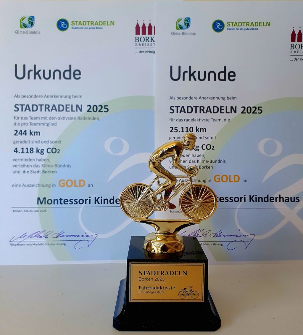 Auch in diesem Jahr hat unser Team des Montessori-Kinderhauses mit viel Engagement am Stadtradeln teilgenommen – und das mit großem Erfolg! In der Wertung der Kitas konnten wir gleich zwei erste Plätze belegen. Dank der tollen Unterstützung und dem sportlichen Einsatz vieler Familien, Kinder und Teammitglieder wurden insgesamt beeindruckende 25.110 Kilometer geradelt – das entspricht…