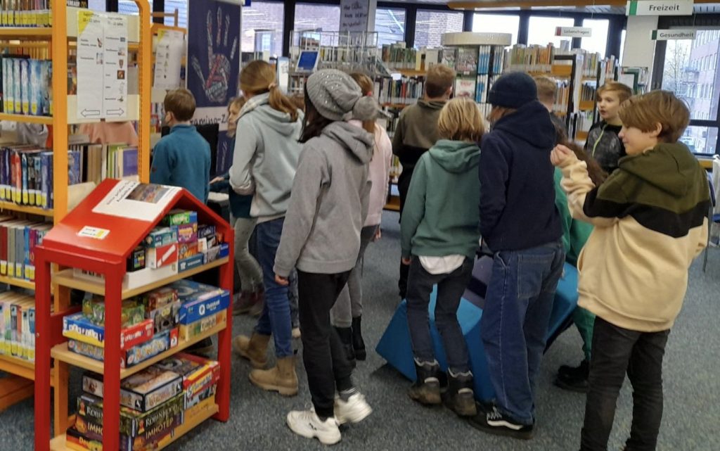 Frau Angela Hoves, die Leiterin der Remigiusbücherei in Borken und die Medienpädagogin Sonja Klann führten die Schüler:innen der 5. Klasse der Montessori-Gesamtschule in die Bücherei und das Ausleihsystem ein. Mit Hilfe der Biparcour-Rallye „Von Idioten umzingelt“ oder „Wer beherrscht das Chaos?“ lernten die Schüler:innen die verschiedensten Bereiche der Bücherei kennen und bekamen einen Eindruck von…